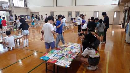 今日は、あじさい読書週間最後の取組として、梅津小学校の体育館で子どもたちが「ほんのもり」に置いてほしい本を手に取って選ぶ「選書会」を開催しました。