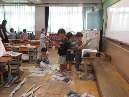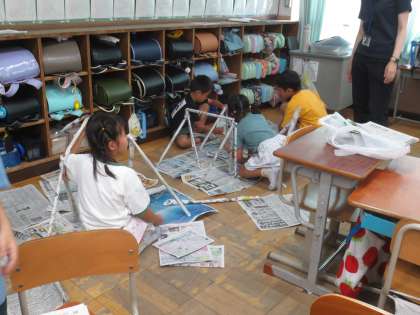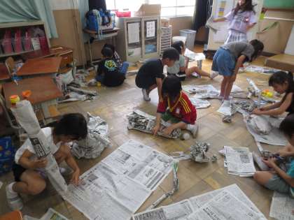 図工「しんぶんしと なかよし」で、新聞紙を使って造形遊びをしました。