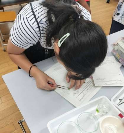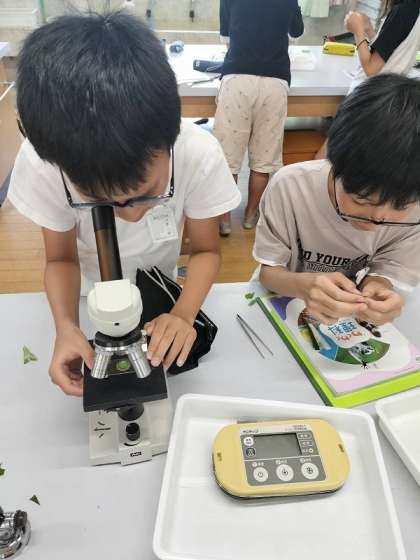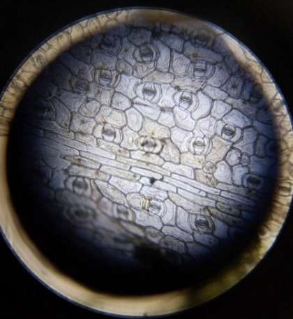 植物が葉から水分を出しているかをホウセンカを使った実験で確かめました。さらに、葉のどこから水分が出ていくのかを確かめるために、葉の裏側を顕微鏡で観察し、水が水蒸気として放出する「気孔」を観察することができました。