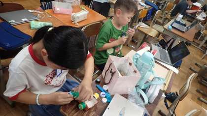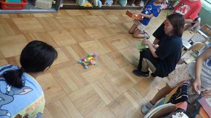 ゴムの力で動き仕組みを生かした乗り物づくりの取り組んでいます。自分が走らせたいと思う動きになるようにするためにはどんなタイヤを使うとよいか、試行錯誤して工夫しながらつくる活動に取り組んでいます。「ゆめの乗り物」になるように、思い思いの飾りつけも楽しんでいます。