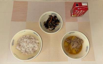 今日は「肉じゃが」です。給食の肉じゃがには、普通の肉じゃがのほかに、「カレー味」や今日の「ピリカラみそ味」など、いくつかの味があります。今日の「ピリカラみそ味」に使われているみそは、「赤みそ」です。「赤みそ」は長時間熟成させるので、色が濃くなって赤っぽく見えます。コクのあるみその味と、一味唐辛子のピリッとした辛みの相性がよく、ごはんとよく合う献立でした。