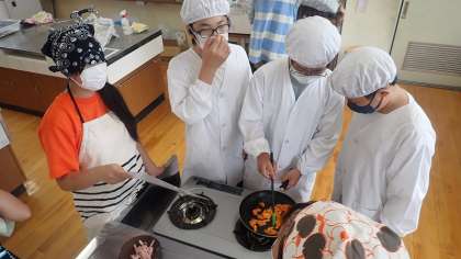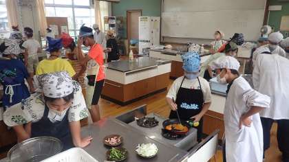 今日は、単元の学習のまとめとして調理実習に取り組みました。時間のない朝でも栄養バランスを意識した朝食にするために、「炒める」調理をしました。事前に確かめた切り方や炒める順番などを確かめながら、「いろどりいため」をつくります。グループのみんなで協力することで、手際よく調理を進めることができました。