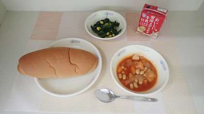 「大豆と鶏肉のトマト煮」は、大豆と鶏肉がとてもやわらかく、トマト味がよくしみこんでいます。大豆のあま味やトマトのうま味を味わいながら、おいしくいただきました。「ほうれん草のソテー」は、ほうれん草にコーンの甘さが加わり、おいしくいただくことができました。