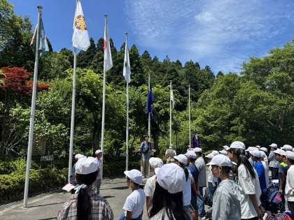 到着後、はじめのプログラムである入所式を玄関前の広場で行いました。はじめに、校歌を歌って校旗を揚げます。