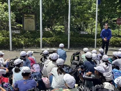 3日間お世話になる花背山の家のスタッフの方に大きな声であいさつをすることができました。山の家のスタッフの方からは、「5分前行動」「お互いにあいさつを」「来たときよりも美しく」の3つについて話をしていただきました。