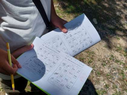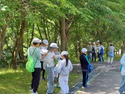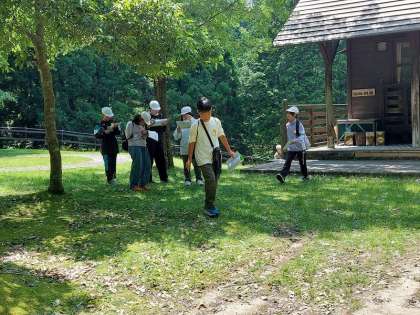 お弁当のあと、午後の活動プログラムである「ネイチャービンゴ」を開始しました。グループで花背山の家の敷地内を歩き、ビンゴカードに書かれている自然をさがします。カードには「カエル」「ヘビ」「コケ」などの物もあれば、「鳥の声」「水の音」「いいにおい」などの物以外の項目もあります。
