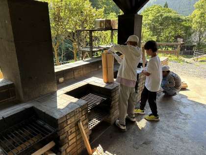 洗わなければならないものはたくさんありますが、みんなで協力して洗っています。薪を組むのは初めてという子がほどんどだと思いますが、しおりを参考にしながら取り組んでいます。