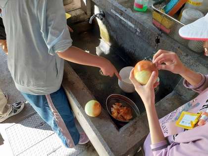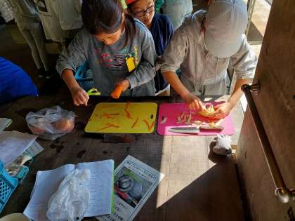 おかず係の子どもたちは、「カレーライス」に入れる野菜の準備をしています。たまねぎやにんじんは、手やピーラーを使って皮をむいています。