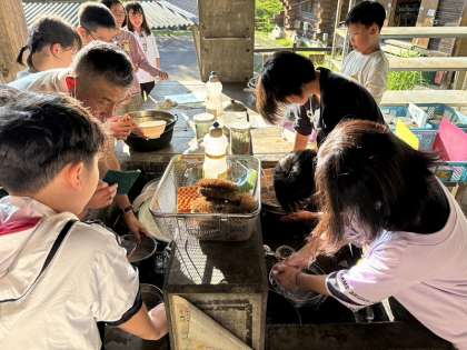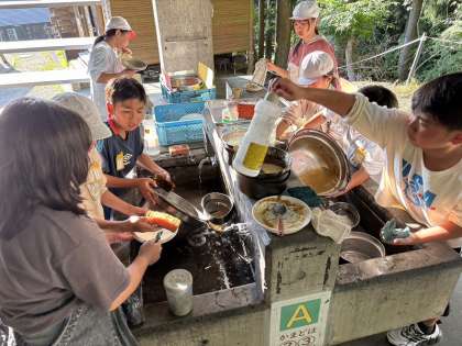 おいしく食べた後は、みんなで後片付けです。家では自分で洗いものをすることがないかもしれませんが、花背山の家では、全部自分たちで協力してやらなければなりません。使った食器や鍋などを、はじめのようにきれいにするために、念入りに洗っています。