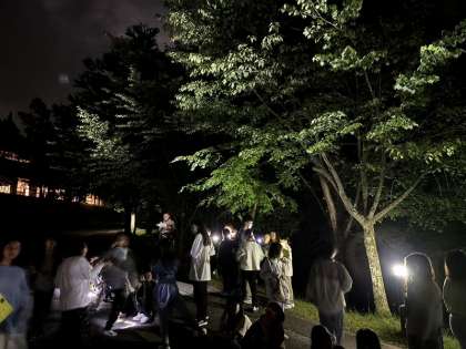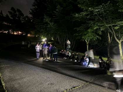 残念ながら雲が出ているようで、星空観察というよりも夜間散策といった趣のようです。ホタルの飛ぶ様子が見られるとているいうことです。昼間の暑さが全くなく、涼しさを感じながらみんなで夜道を歩きました。