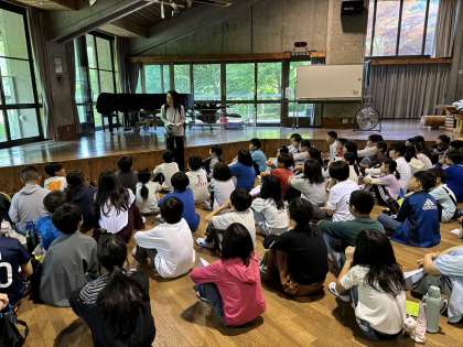 子どもたちは、朝の支度を済ませてオリエンテーションホールに集合しました。グループごとに健康観察を済ませてから、朝の連絡を聞いています。