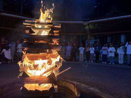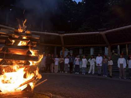 キャンプファイヤーの炎をみんなで囲んでみんなで歌を歌い、楽しいゲームの始まりです。