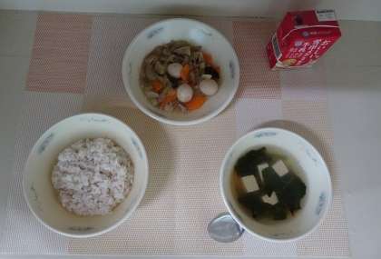 「うずら卵とキャベツのいため煮」は、豚肉、にんじん、キャベツ、うずら卵、干しいたけと、たくさんの具材が入っています。ちょうどよいとろみがついていて、ごはんとの相性もぴったりです。たくさんの具材の味や食感を楽しんで、おいしくいただきました。「とうふと青菜のスープ」は、とうふ、にんじん、ほうれん草を煮てつくっています。スープのうま味と食感の違いを感じながらおいしくいただきました。