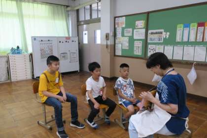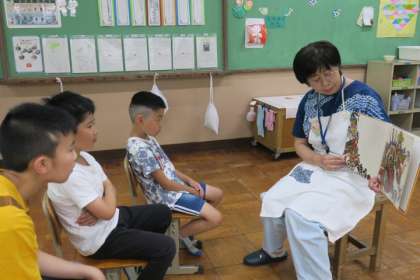 むくのき学級での読み語りの様子です。7月のこの時期に合わせて、うめのこさんには、『祇園祭』についての本を読んでいただきました。「行ったことあるよ。」「四条通だね。」など知っていることを話していた子どもたちです。