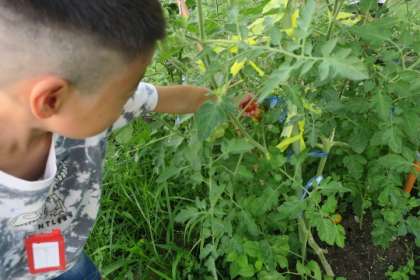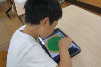 収穫した野菜は、ピザ作りで使う予定です。このピザ作りに向けて、作る工程を確認したり、生地に乗せる野菜やその切り方を考えたりしました。タブレット上では、それぞれがオリジナルのピザを考え、トマトソースやバジルソースを生地に塗り、トッピングの野菜を乗せる位置を考えました。