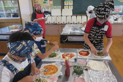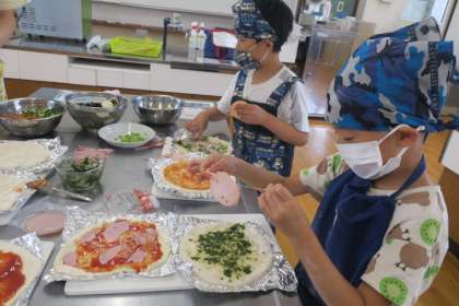 トマトソースとバジルソースから好きなソースを選び、夏野菜を乗せていきます。完成したらチーズも乗せていきます。具材をお顔の形にして乗せる友達もいましたよ。