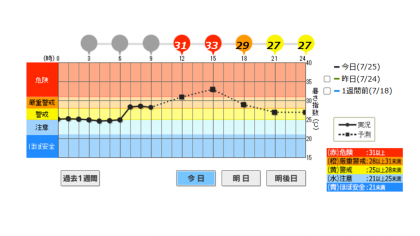 本日は京都市に熱中症警戒アラートが出されています。10:00時点での運動場における暑さ指数(WBGT)の実測値が31.0と【危険領域】になっているため、運動場開放を中止します。