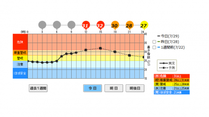 本日は京都市に熱中症警戒アラートが出されています。9:50時点での運動場における暑さ指数(WBGT)の実測値が31.7と【危険領域】になっているため、運動場開放を中止します。