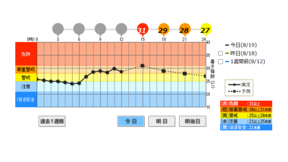 本日は京都市に熱中症警戒アラートが出されています。12:40時点での運動場における暑さ指数(WBGT)の実測値が32.4と【危険領域】に達したため、午後の運動場開放を中止します。
