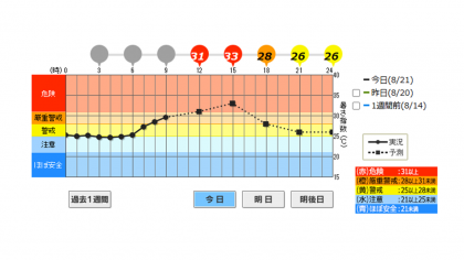本日は京都市に熱中症警戒アラートが出されています。9:55時点での運動場における暑さ指数(WBGT)の実測値が32.0と【危険領域】になっているため、運動場開放を中止します。