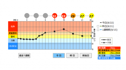 本日は京都市に熱中症警戒アラートが出されています。9:40時点での運動場における暑さ指数(WBGT)の実測値が31.1と【危険領域】になっているため、運動場開放を中止します。