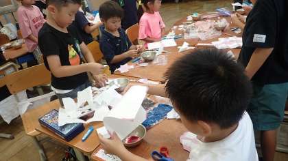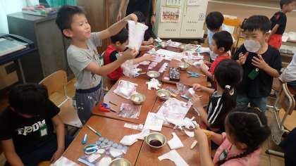 1人1鉢で育てたアサガオから取れた花をもってきて、色水をつくりました。その色水に折りたたんだ紙を浸して、模様づくりをしました。白い紙が染まっていく様子や、紙を広げたときにできた模様を見て子どもたちも喜んでいます。