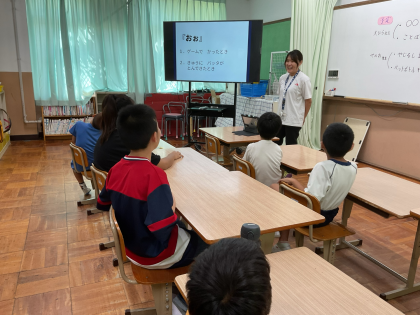 前半は、「おぉ」という言葉を使って、声の調子や表情によって伝わる気持ちが変わることを体験しました。驚き、感心など、同じ言葉でも状況や感じ方によって意味が変わることを学び、児童たちは楽しみながらも真剣に取り組んでいました。