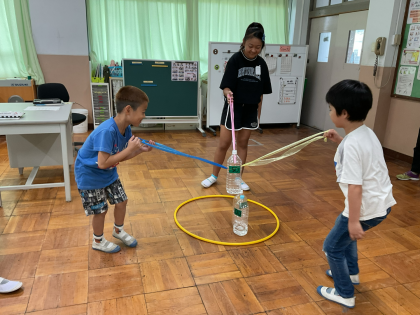 後半は、「ペットボトルUFOキャッチャー」に挑戦しました。輪ゴムを使ってペットボトルをつかむゲームでは、友達と声をかけ合い、相談しながら力加減を工夫する姿が見られました。うまくキャッチできたときには、自然と笑顔があふれ、達成感を味わっていました。