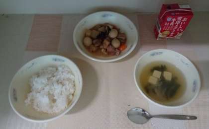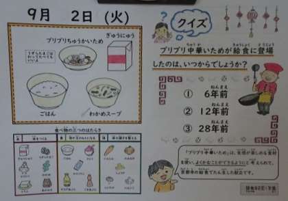 今日は、子どもたちに大人気の「プリプリ中華いため」です。昨日のカレーライスに続く人気の献立に、子どもたちも大喜びです。ピリッとした一味唐辛子の辛さと、プリプリした食感を楽しんでおいしくいただきました。