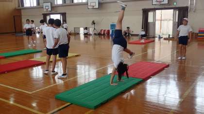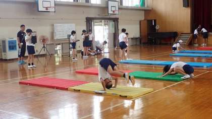 6年生は、体育の「マット運動」の学習をしています。