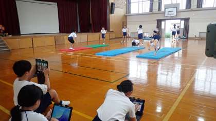 技のポイントを確かめながら練習したり、技の出来栄えを確かめるためにGIGA端末で動画を撮影したりしながら学習を進めています。