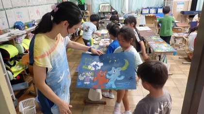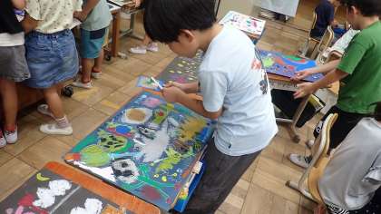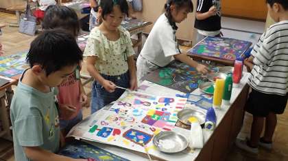 「ちいちゃんのおもちゃたち」というお話を聞いて想像したことをもとに、お気に入りの場面を絵に表しました。とてもにぎやかな様子が表現できています。今日は、作品づくりの仕上げとして、作品の背景部分に絵の具でスタンプをしたり、歯ブラシと網で絵の具を飛ばしたりしました。