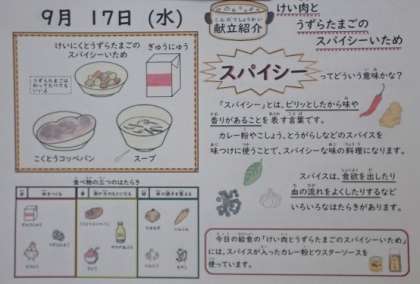 「鶏肉とうずら卵のスパイシーいため」は、いろいろなスパイスの入ったカレー粉やウスターソースを味つけに使うことで、スパイシーな料理になっています。スパイスには、食欲を出したり血の流れを良くしたりするなどのはたらきがあります。ピリッとスパイシーな味つけを楽しんで、おいしくいただきました。