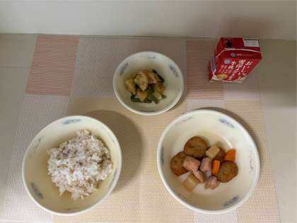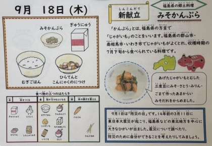 「かんぷら」とは、福島県の方言で「じゃがいも」のことをいいます。福島県の郡山市・南相馬市・いわき市でじゃがいもがよくとれ、収穫時期の7月下旬から食べられている料理です。給食の「みそかんぷら」では、あげたじゃがいもと蒸した三度豆に、みそ、砂糖、みりん、ごまでつくった甘辛いみそだれをからめました。新献立でしたが、子どもたちは喜んでたくさん食べていました。