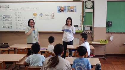 梅津小学校に来ていただいているALTの先生に、自分の名前や好きなものを英語で伝える活動に取り組みました。色や天気などの英語での言い方を確かめて、“I like ○○.”と好きなものを紹介していました。