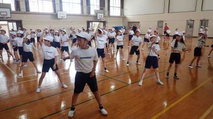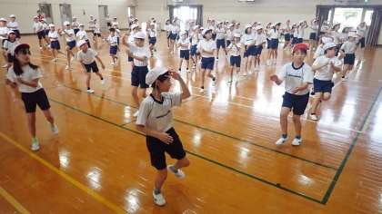 4年生は、沖縄民舞に取り組みます。まず、基本となる振り付けをひとつひとつ確認しています。舞台の上で踊る担任の先生のお手本を見ながら、足の運び方や手の動かし方を確かめて踊っていました。