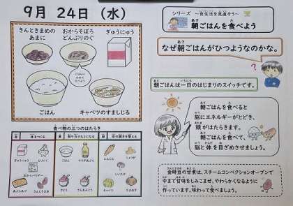 「おからそぼろ丼」は、子どもたちの大好きなごはんに混ぜて食べる献立です。あまからい味付けの鶏ひき肉やおからがごはんにぴったりで、いつもよりもたくさんごはんを食べることができました。「金時豆の甘煮」は、スチームコンベクションオーブンで調理しています。中まで甘味がしみ込んだやわらかい金時豆をおいしくいただきました。