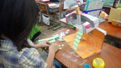 小石やペットボトルキャップなどでつくった「小さな友達」が楽しく過ごすことのできる「ともだちハウス」をつくっています。空き箱やパックなど身近な材料を使って、思い思いの「ともだちハウス」を表現しているところです。つくっている様子を見ていると、「先生、聞いて!あんな、これがすべり台でな…」「先生、これサウナやねん!」など、すてきなところをいっぱい教えてくれました。