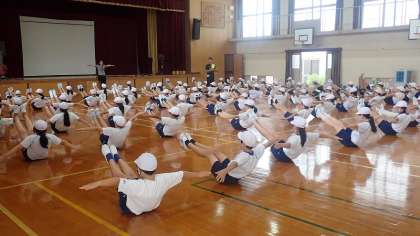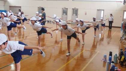 前回練習した技の確認や、新しい技の練習に取り組みました。1本脚で立ってバランスをとる「片足バランス」は、はじめはふらふらする子どもたちがたくさんいましたが、少し練習の時間をとるとピタッと決まる子が増えました。困っている子には周りの友達がポイントを教えて、一緒に練習する姿がすてきでした。
