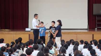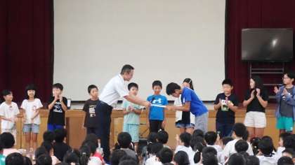 朝会のあとは、図工の作品で表彰を受けたみなさんの表彰式を行いました。代表の子どもに校長先生から賞状を渡していただき、賞をもらったみんなに大きな拍手がおくられました。