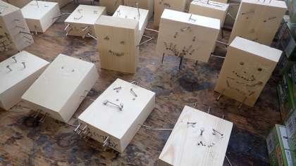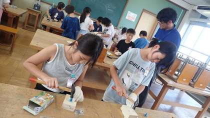 木材にいろいろな太さや長さのくぎを打ち込んでいきます。釘の頭まで打ち込む釘、途中まで打ち込む釘などを交ぜることで、いろいろな表現ができます。安全に気を付けて金づちを使い、真剣な表情で作品づくりをしていました。