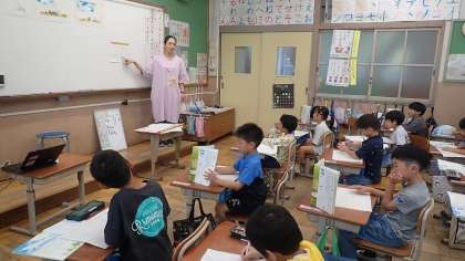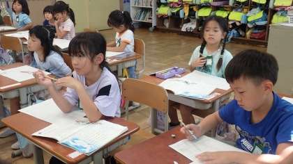 今日は、お話の全体をとらえる学習をしました。「いつ」「どこで」「だれが」を確かめ、どんな出来事が起こるのかをみんなで読み取りました。教科書に書かれていることを確かめて、プリントに書いていきました。