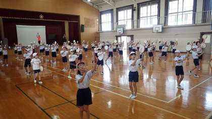 4年生は、沖縄民謡の「エイサー」に取り組みます。小さな手持ちの太鼓の「パーランク」を持ち、打ち鳴らしながら演技の練習をしています。演技の振り付けを揃えるのはもちろんですが、「パーランク」の音もぴったりそろえなければなりません。みんなの心が一つにそろうように、さらによい演技をめざしてがんばっています。