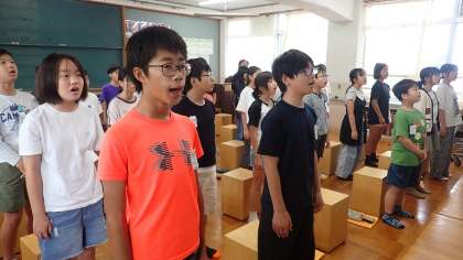 時間の最後に、学童大音楽会で歌う「U&I」の練習をしました。のびやかで響きのある声で歌うために、たっぷりと息を吸うことやお腹の支えを意識して歌いました。