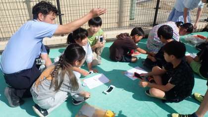 午前と午後で影の向きが変わることについて、どうしてこのような変化があるのかを調べています。影の向きと長さが記録できるような観察記録セットをつくり、グループの友達と協力して記録をつけています。観察から、どんなことがわかるようになるでしょうか。
