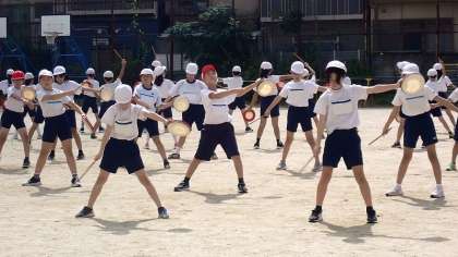 運動場で、エイサーの演技を合わせました。体育館とは違って広い運動場では、パーランクの音の響きも違って聞こえてくるので、本番をイメージしながら練習をしました。手の回し方や体の動かし方を大きくすることで、迫力のある演技になります。本番の演技を楽しみにしていてください。