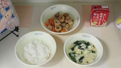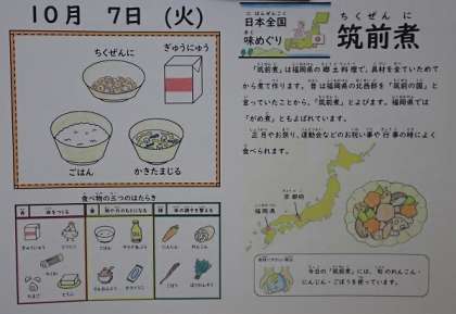 「筑前煮」は、福岡県の郷土料理で、具材をすべて炒めてから煮てつくります。昔は、福岡県の北西部を「筑前の国」と言っていたことから「筑前煮」と呼びます。正月やお祭り、運動会などのお祝い事や行事のときによく食べられます。具材には、旬の食材であるれんこん、にんじん、ごぼうが使われていて、食材の味を楽しんでおいしくいただきました。