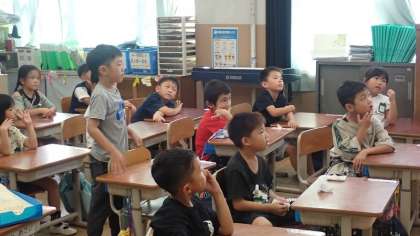 今日は、体の部分を表す言い方を学習しました。それらの部分を覚えるために、「ミッシングゲーム」に挑戦しました。“head”“eyes”“toes”などの言い方を覚えた後は、みんなで“Head,shoulders,knees,and toes”を歌いました。