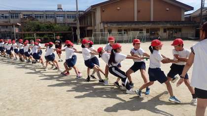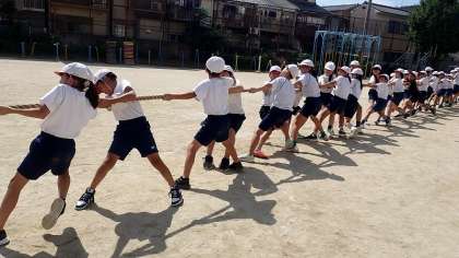 5年生が団体競技で取り組むのは「綱引き」です。今日は、実際に運動場で綱を引く練習をしました。5年生みんなで引くと、さすがに迫力いっぱいです。また、綱引きを盛り上げる演技パートの練習もしました。5年生らしいユニークな内容になっています。楽しみにしていてください。