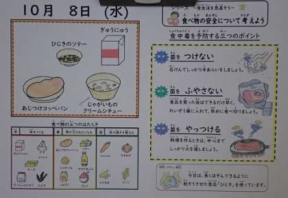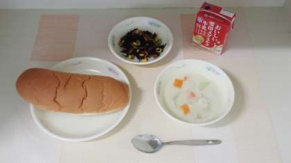 「じゃがいものクリームシチュー」は、給食調理員さん手作りのコクたっぷりのルーと、たくさん入った食べ応え満点のじゃがいもがおいしい献立です。たまねぎやにんじん、鶏肉と一緒においしくいただきました。
